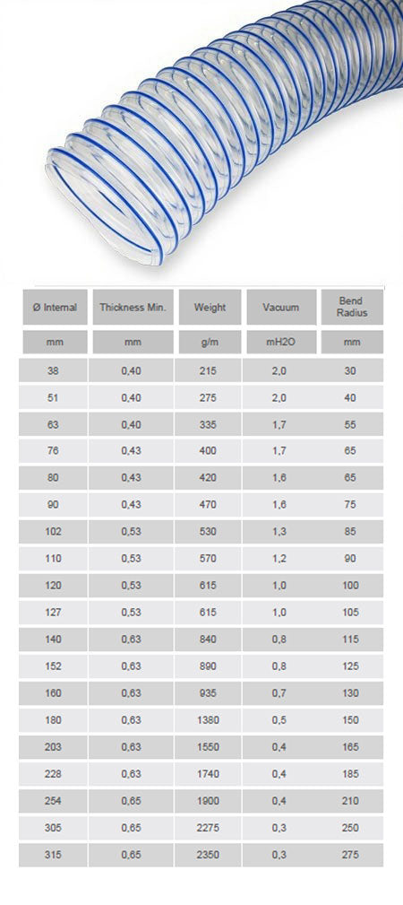 The PUR Blue clear extraction hose is a flexible duct made from polyurethane, reinforced internally with a steel spiral coated in blue polyurethane. It offers excellent flexibility and abrasion resistance, making it well-suited for dynamic usage.